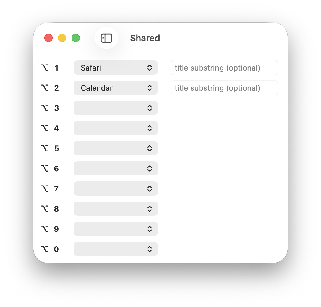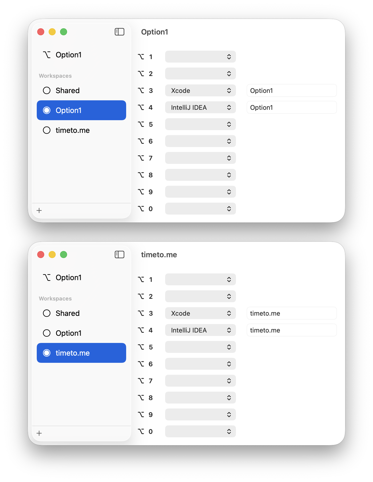 This means ⌥-3 opens Xcode window with Option1 in the title, and ⌥-4 with timeto.me. Solved!