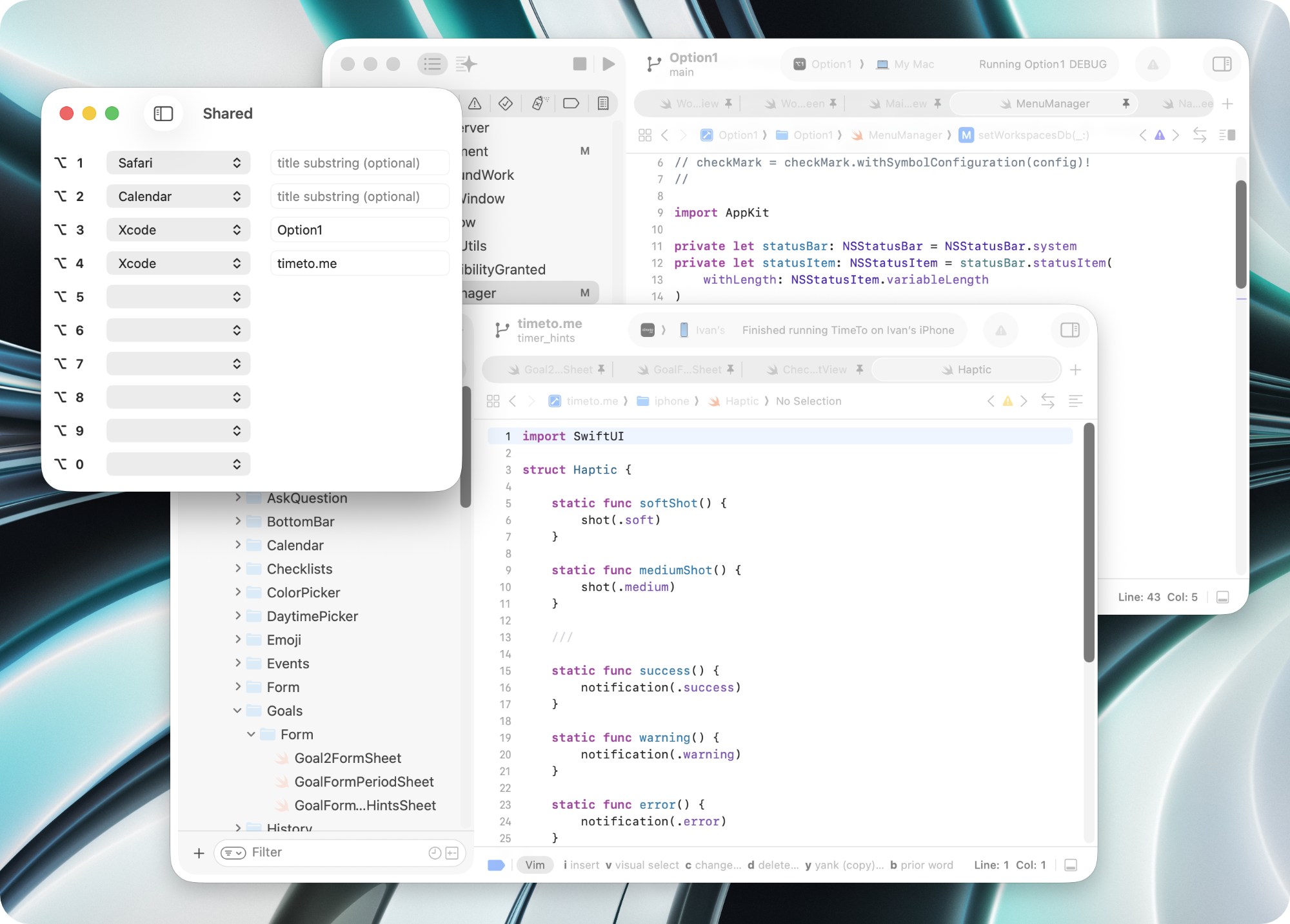 Let's say we have two windows for one app, like two Xcode projects. We cannot open the window we need with built-in ⌘-Tab because macOS opens apps, not windows. Let's solve this with Option1.